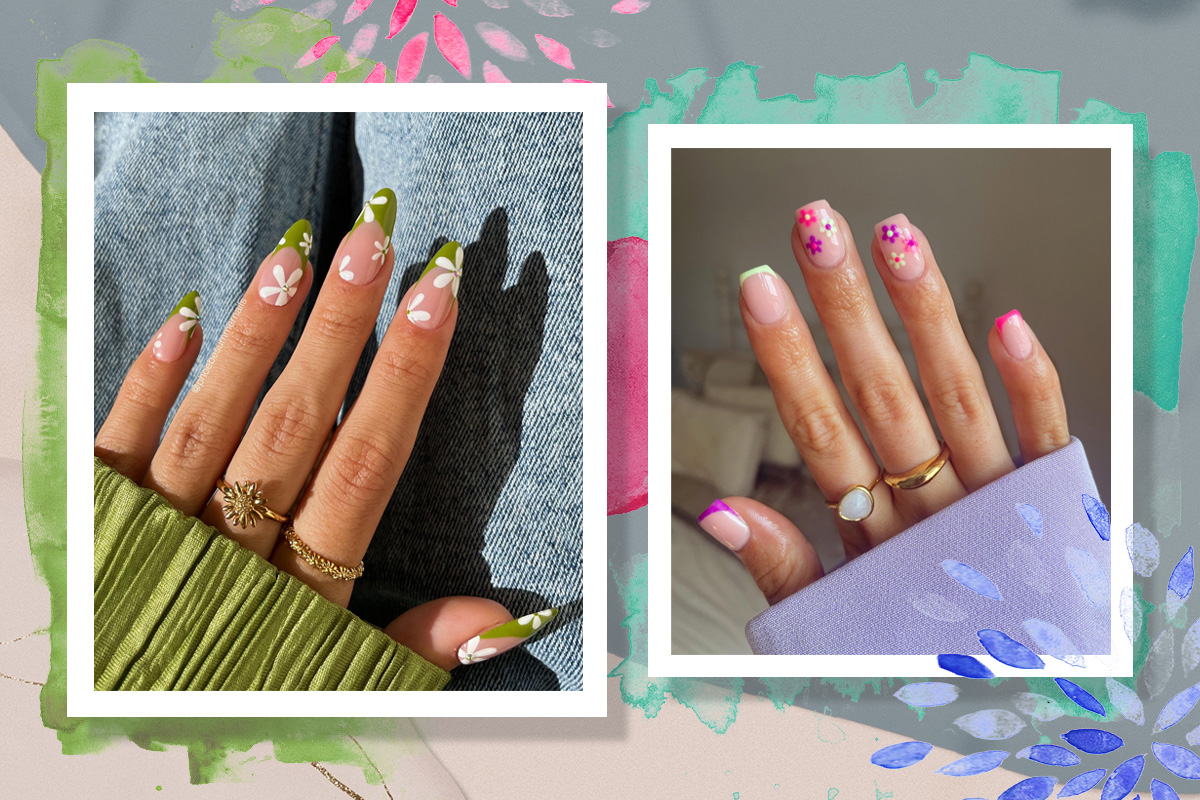 Еще одна идея красивого весеннего маникюра, которую оценят любители цветочных дизайнов и цветного френча. Полоски на кончиках ногтей сделайте разными яркими оттенками, а сами цветочки оставьте белыми с темными серединками.
