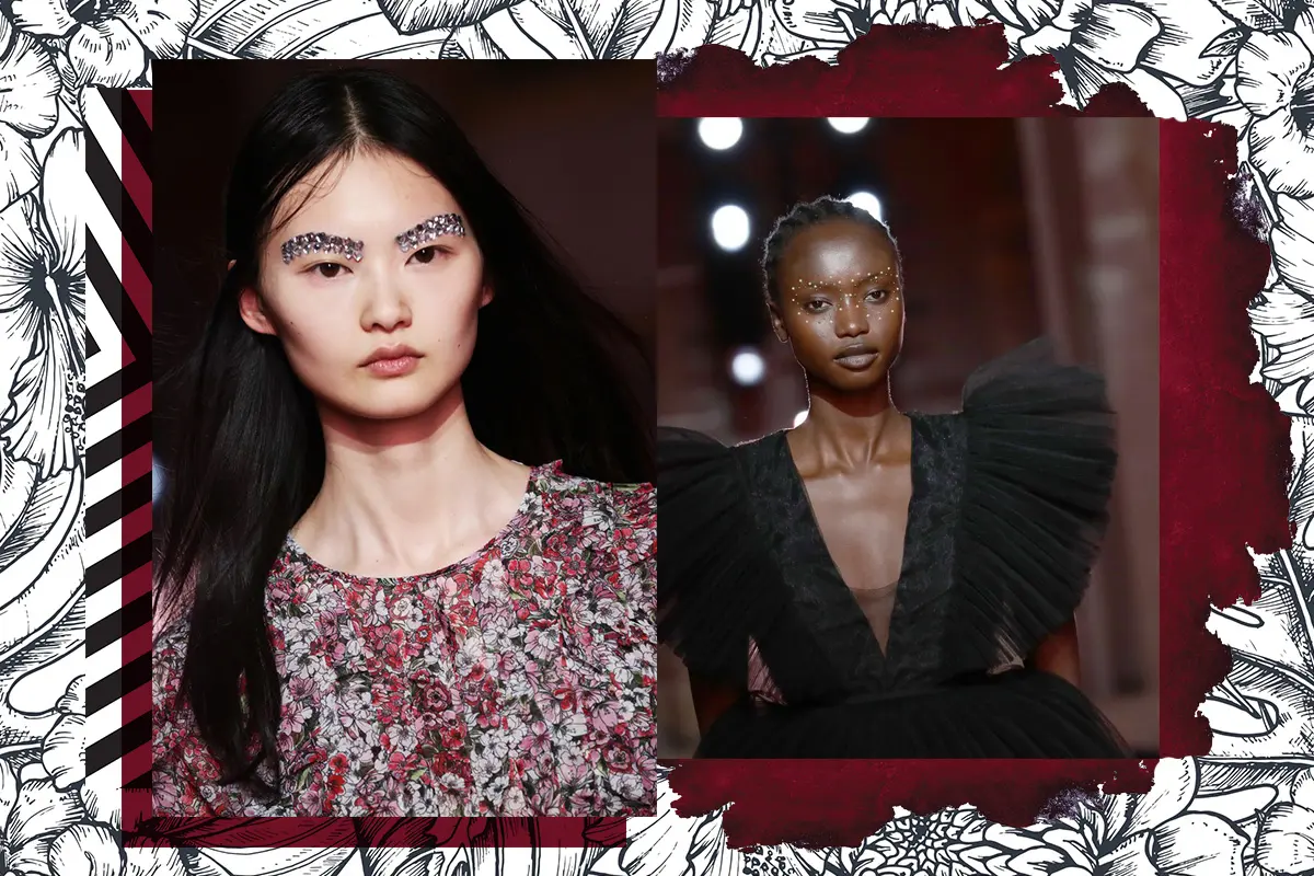 Брови — всему голова, особенно в креативных макияжах Исамайи Френч, которая терпеть не может банальности. Первый и главный бьюти-прием — это мерцающие брови, которые легко создать, используя фиолетовые или серебряные стразы, а также красный глиттер. Стоит обратить внимание, что мерцающие брови – единственный акцент в макияже моделей. Если захотите также добавить блеска глазам или губам, легко превратите модный макияж в грим для Хэллоуина.