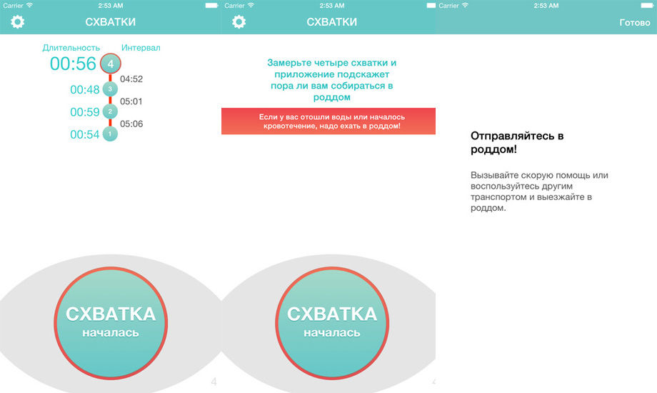 После замера нескольких схваток приложение проанализирует длительность и интервал между ними и определит, когда вам нужно выезжать в роддом. Проверено на реальном опыте – помогает сэкономить нервы и вовремя обратиться к врачу.
