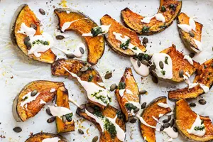 Сок лимона смешать с оливковым маслом, горчицей и оставшимся медом, добавить соль и перец. Тыкву, листья шпината положить в миску и заправить горчичной смесью. Опционально добавить горсть кедровых или грецких орехов, или авокадо. Не вегетарианцы могут попробовать вместе с тыквой запечь куриное филе.