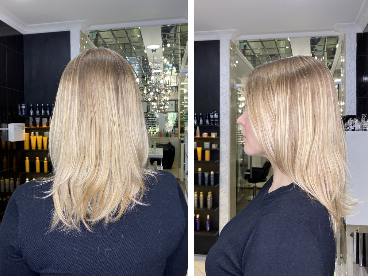 Два часа пролетели незаметно. За время нашего разговора-интервью Светлана «промелировала» мне верхние слои волос, кроме задней затылочной зоны, дабы сохранить больше локонов нетронутыми, но при этом визуально осветлила всю голову. Тонирование в холодных тонах, как мы и оговаривали раньше. (Но все блондинки всегда хотят «еще светлее», и здесь нужна мудрость мастера, чтобы сделать все максимально безопасно для волос).