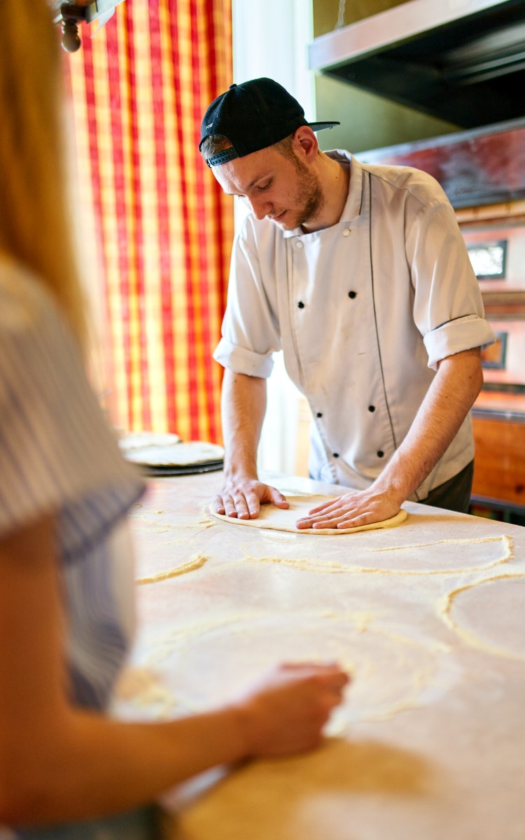 Аутентичная кухня в ресторане представлена блюдами, собранными по всей территории Италии. Здесь вам и домашняя паста с различными ингредиентами, и ризотто, и мясное гриль-меню, и итальянские десерты, и сезонные салаты, и конечно же, неаполитанская пицца, которую мы всей редакцией готовили для себя сами. Признаемся честно, не без помощи поваров, которые специализируются на приготовлении пиццы.