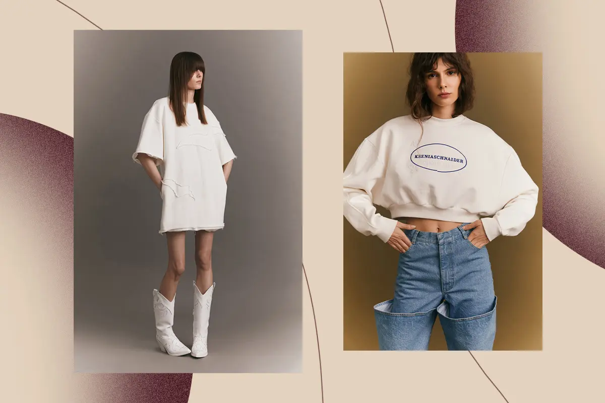 В новой коллекции Ксения Шнайдер продолжает исследовать пересечение спортивного и утонченного – на этот раз перейдя к мешковатым силуэтам в стиле хип-хоп одежды 90-х в сочетании с невероятно женственными объемными рукавами и лентами, а также пиджаками и брюками из винтажной жаккардовой ткани.