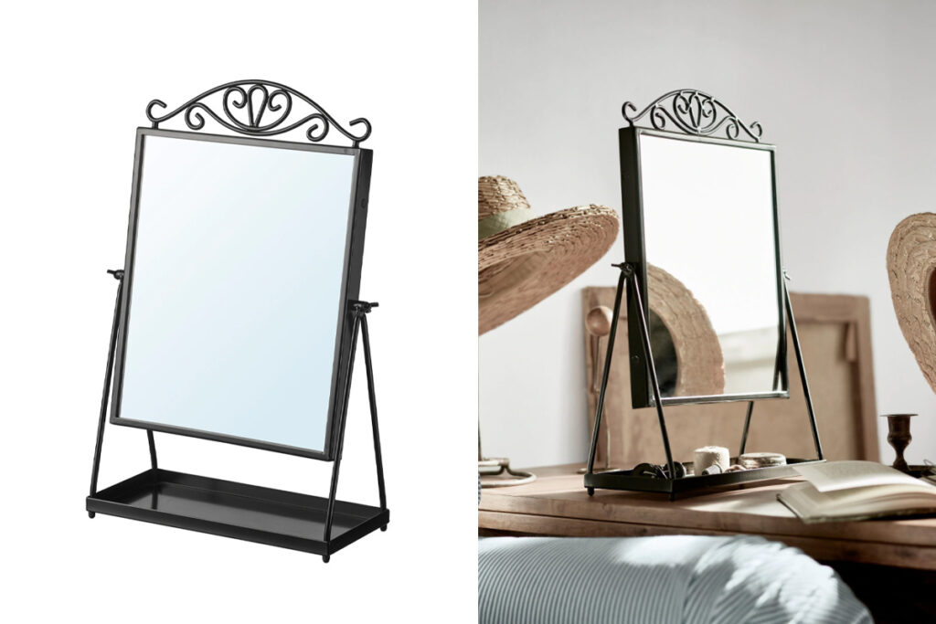 Небольшое декоративное зеркальце станет украшением вашего туалетного столика, прикроватной тумбы или любого другого места, где вам удобно делать макияж и поправлять прическу. За практичность отвечает компактный размер изделия, ведь его можно легко перемещать при необходимости, а винтажная съемная деталь сверху позволит создать стиль зеркала по настроению – более нарядный или минималистичный. Поднос под зеркальцем послужит местом хранения для мелких аксессуаров для волос или украшений.