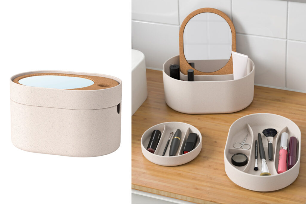В подставках и компактных ящиках удобно хранить косметику, парфюмы, ванные принадлежности, украшения, аксессуары для волос и т.д. Наш фаворит – коробка-органайзер в нежном бежевом оттенке с зеркальцем и съемными вставками, которые можно переносить с собой. 12 маленьких отделений идеально подходят для хранения пинцета, пилочки для ногтей, маникюрных ножниц, контактных линз, заколок, гребней для волос и разных бьюти-мелочей.