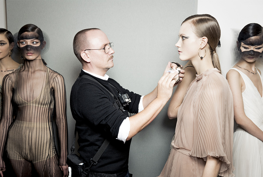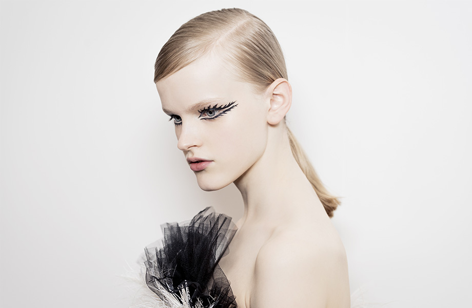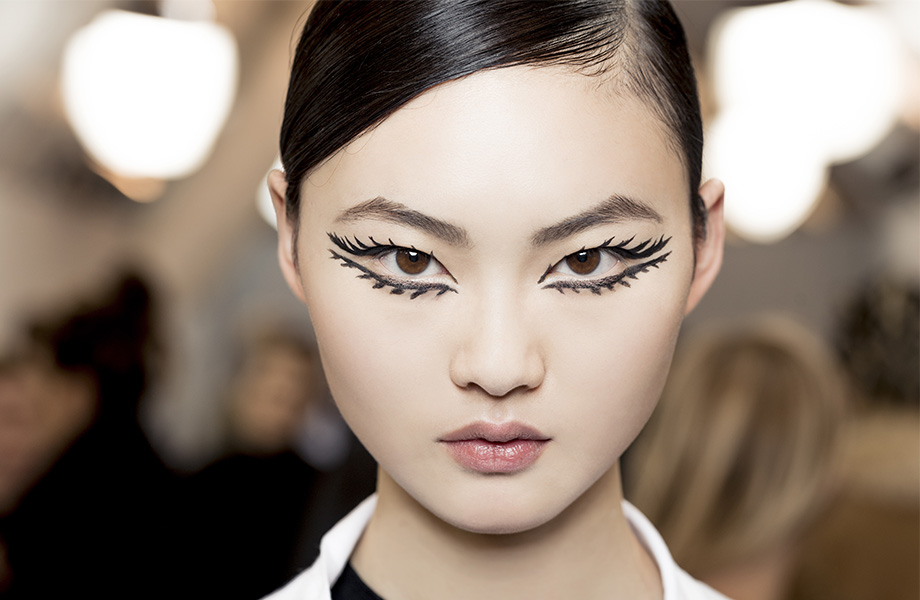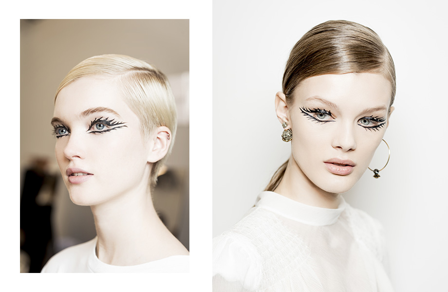 Стрелки визажист нарисовал черным матовым лайнером Diorshow On Stage Liner, имитируя кукольные ресницы. Слизистую нижнего века и линию роста ресниц Филипс подвел бежевым лайнером Diorshow Khol. Брови подчеркнул двумя средствами – карандашом Sourcils Poudre Pencil и тушью Diorshow Bold Brow.