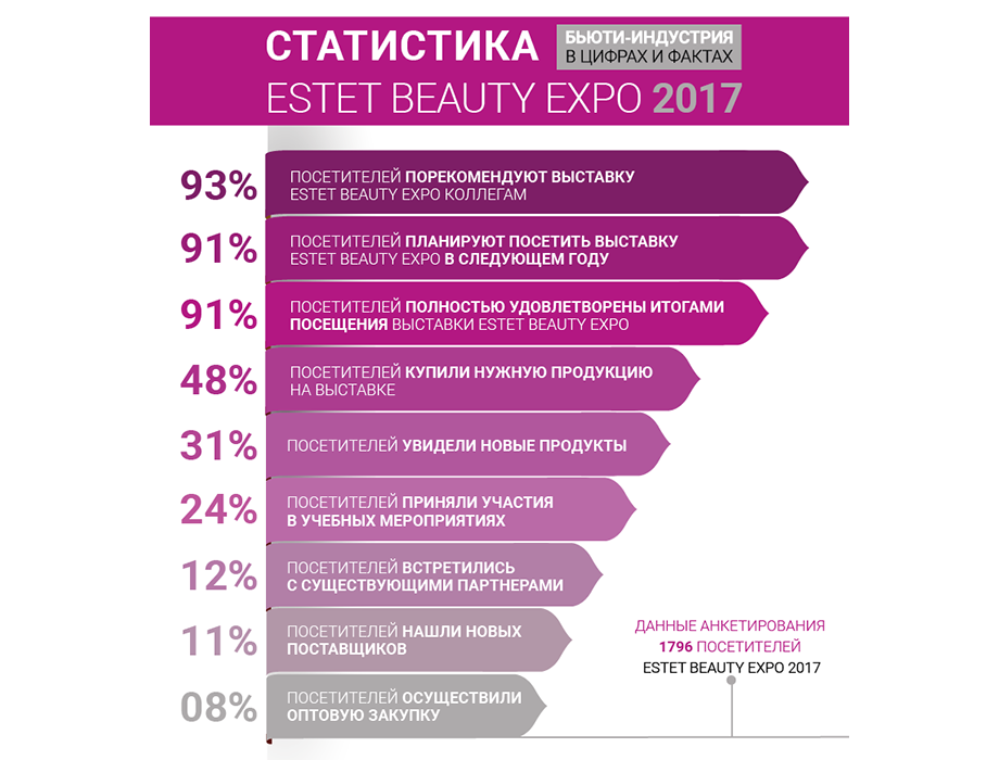 Об успехе мероприятия можно писать много и долго, но это как раз тот случай, когда лучше один раз увидеть, чем сто раз услышать. И если вы никогда в жизни не были на Estet Beauty Expo, статистика прошлогоднего ивента убедит вас наконец-то побывать там.
