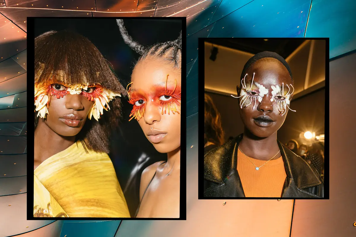 Модели были похожи на волшебных лесных существ и буквально расцветали благодаря своим богато украшенным, пропитанным пыльцой ресницам. Лепестки, перья, кристаллы, глина, краска, жемчуг, блестки и пирсинг – все было взято из собственного архива мультимедийных материалов Макграт для украшения лиц моделей и создания органичных, роскошных образов. Чтобы сосредоточиться на красочных лепестках, кожа и губы были влажными, но естественными. Лица моделей, увенчанные роговыми косами Холли Смит и текстурированными париками, с зелеными, похожими на стебли ногтями Дон Стерлинг, напоминали выбеленные или огненные флуоресцентные психопсисные орхидеи. Некоторые выглядели как дышащее «восстание роз» с призрачными лепестками, с глиняными мазками, которые, казалось, отслаивались.
