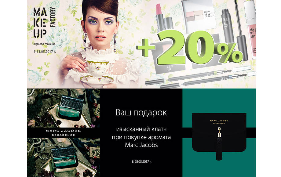 На сайте letu.ua объявлена дополнительная скидка 20% к дисконтной карте на продукцию марок ANNY, Makeup Factory. До конца мая в интернет-магазине также действуют специальные цены на товары брендов Korres, Skincode, Payot. Еще один приятный сюрприз: при покупке ароматов Lanvin, Marc Jacobs и Boucheron получите в подарок клатч или сумку от бренда.