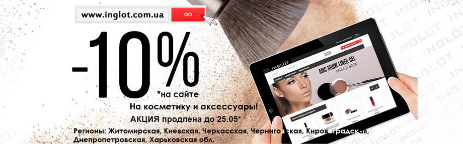 Сайт объявил скидку 10% на косметику и аксессуары бренда. Распространяется она не на все регионы Украины. Подробности на сайте бренда.