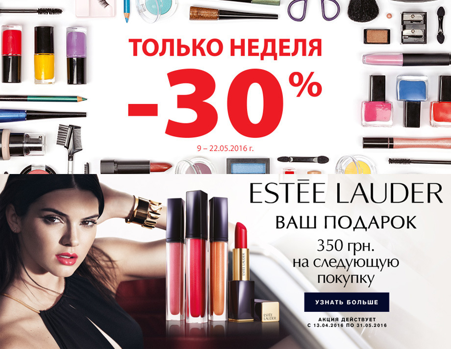 До 22 мая действует скидка 30% на косметику и парфюмерию CALVIN KLEIN, Davidoff, Pola, Orlane, Collistar, Ferre, Armand Basi, Lacoste, Angel Schlesser, Blumarine, DSQUARED2, Make up Factory, James Bond, Misslyn, ANNY, Ayres, Loewe, La Prairie, V&R, Giorgio Armani, YSL, Euphytos, Phytomer, Deborah, Transvital, Adidas. Скидка по дисконтной карте не суммируется. До 7 июня в магазине Brocard в ТРЦ Ocean Plaza действует акция «Скидка до 50%» на определенные группы товаров, кроме подарочных карт и продукции Kiehl’s. Количество акционного товара ограничено. Карта на скидку выдается каждому покупателю в период проведения акции. До конца месяца в сети магазинов Brocard приобретая продукцию Estee Lauder на сумму от 1500 грн, покупатели получат скидочную карту на сумму 350 грн. До 29 мая при покупке двух продуктов Lirene в подарок – BB cream и при покупке двух продуктов Dr Irena Eris – жидкий карандаш для глаз. До 22 мая при покупке продукта по уходу за телом Clarins в подарок – набор по уходу «Омолаживающий» (кремы для рук и ног). Также до 20 июня на туши Clarins действует специальная цена. Подробности – на Letu.ua и Brocard.ua.