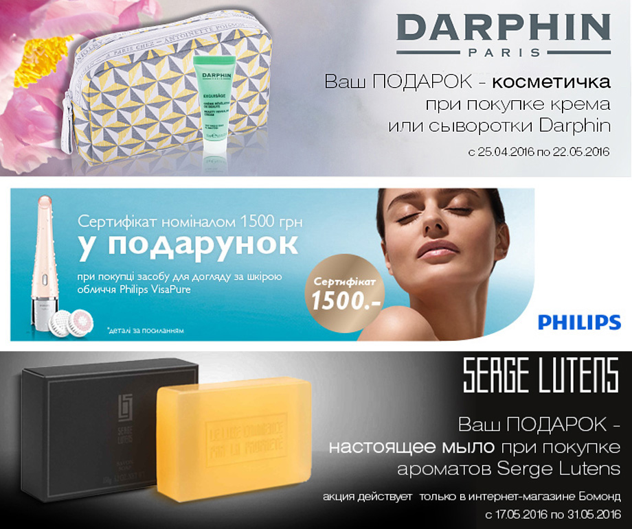 При покупке средств Sensai, Pupa, IsaDora и Darphin до 22 мая вы гарантированно получаете подарок – косметичку с наполнением. При покупке ароматов Serge Lutens и SueWong вас также ожидают подарки. Покупая гаджет по уходу за кожей Philips VisaPure, в подарок – сертификат номиналом 1500 грн. Bomond.com.ua