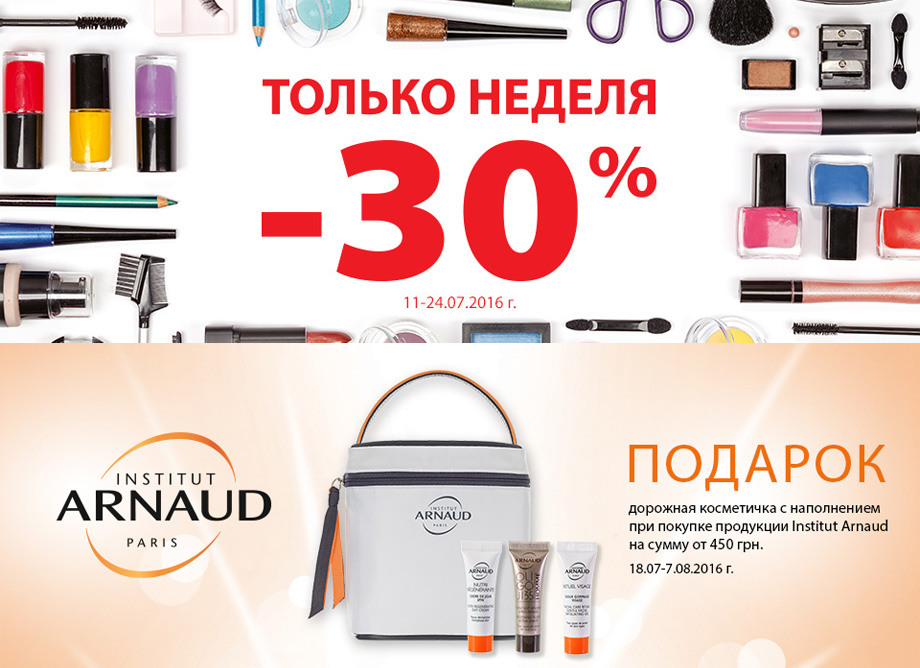 До 24 июля скидка 30% в интернет-магазине www.letu.ua на продукцию Ayres, Bentley, Boss Hugo Boss, Chloe, Clarins, Eisenberg Paris, Gianfranco Ferre, Hugo, Lancaster, Orlane, Skincode. До 24 июля при покупке средств Lirene на сумму от 165 грн в подарок – мицеллярная вода; при покупке Artdeco на сумму от 400 грн – косметичка и блеск для губ Lip Brilliance 61; при покупке 2-х единиц Dr Irena Eris – жидкость для снятия макияжа; при покупке продукции Collistar для автозагара или из солнечной линии в подарок – дорожный набор в косметичке; при покупке крема для лица Qiriness в подарок – дорожный набор; при покупке карандаша для глаз Givenchy Khol Couture в подарок – тушь для ресниц. До 24 июля действует скидка 30% на декоративную косметику для губ Make up Factory. До конца месяца при покупке минеральной воды для лица Еvian 300 мл в подарок – минеральная вода объемом 50 мл; при покупке СС крема Gosh в подарок – СС крем 02. До 24 июля действует скидка 30% на продукцию Pola. До 7 августа при покупке продукции Institut Arnaud на сумму от 450 грн в подарок – дорожная косметичка с наполнением; при покупке аромата Moschino – fresh-набор: туалетная вода, гель для душа, лосьон для тела.