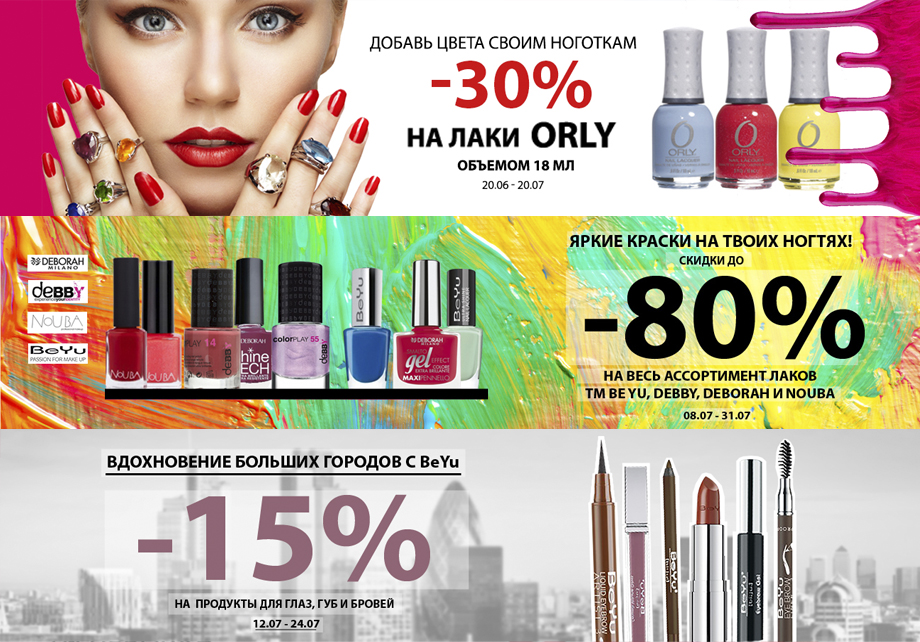 В онлайн-магазине действует скидка до 50% на продукцию по защите от солнца. Действуют скидки: 20% – на AHAVA, Eupythos, Everyday Minerals, Gosh, 24% – на Deborah, Rimmel, Lumene, 25% – на Maybelline, Garnier, L’Oreal Paris, Zoya, Naomi, Uni.Tech Professional, 30% – на Christina, 40% – на Gelish, 50% – на Debby. Все покупатели Garnier, L’Oreal, Ziaja, Hempz, Declare, Estel получат гарантированные подарки. До 24 июля действует акция на продукцию Valmont: скидка 20% на каждый второй товар. До конца месяца в магазине действует скидка 60% на лаки для ногтей. Parfums.ua