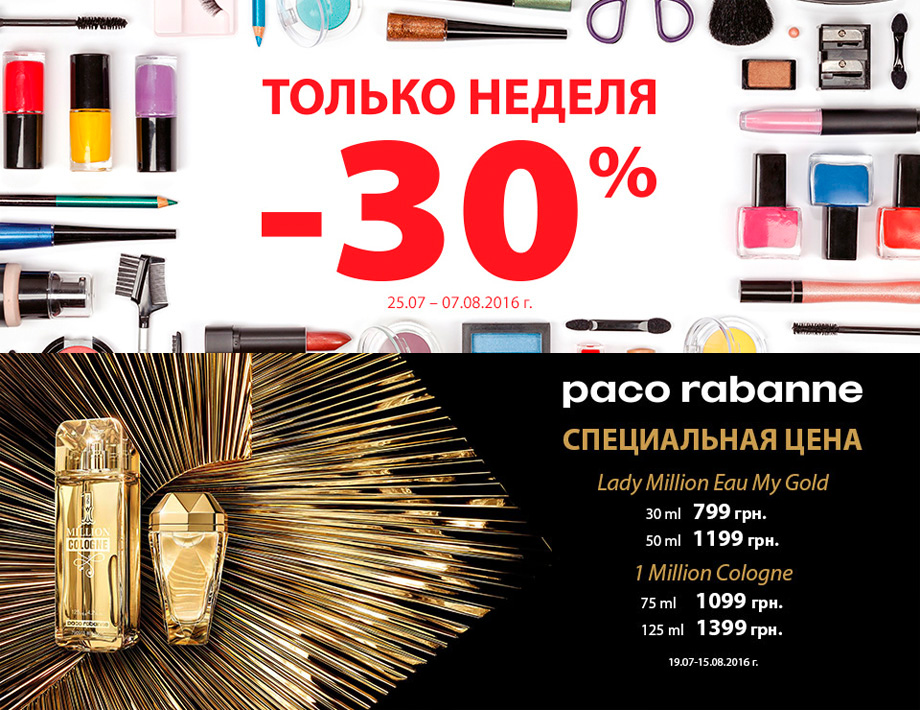 До 7 августа действует скидка 30% в интернет-магазине www.letu.ua на продукцию Angel Schlesser, Annayake, ANNY, Artdeco, Calvin Klein, Jaguar, Korres, Lanvin, Venus, SachaJuan. До 7 августа при покупке средств Institut Arnaud на сумму от 450 грн в подарок – дорожная косметичка с наполнением; при покупке аромата Moschino – fresh-набор: туалетная вода, гель для душа, лосьон для тела. До 14 августа при покупке пудры Givenchy из коллекции Les Saisons в подарок – кисть кабуки. До 15 августа действуют специальные цены на ароматы Paco Rabanne Lady Million Eau My Gold! и 1 Million Cologne. До 16 августа действуют специальные цены на продукты по уходу за кожей лица марки Payot.