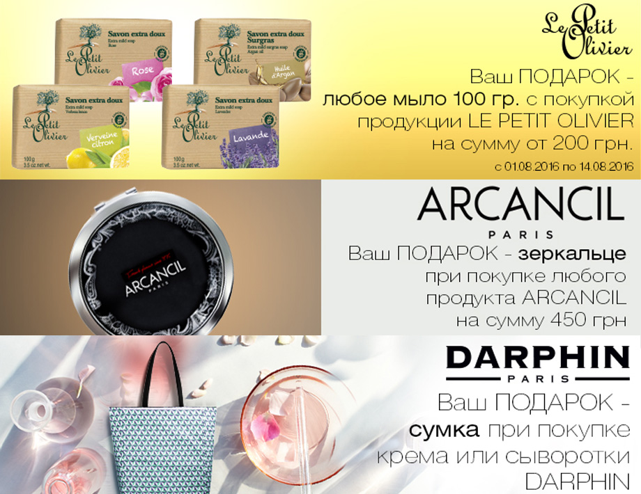 До 7 августа при покупке любого продукта солнечной линии Sisley в подарок – пляжная сумка. До 14 августа при покупке товаров Le Petit Olivier на сумму более 200 грн – мыло в подарок. До 28 августа при покупке продукции Arcancil от 450 грн в подарок – зеркало, при покупке крема или сыворотки Darphin на выбор – cумка в подарок. Bomond.com.ua