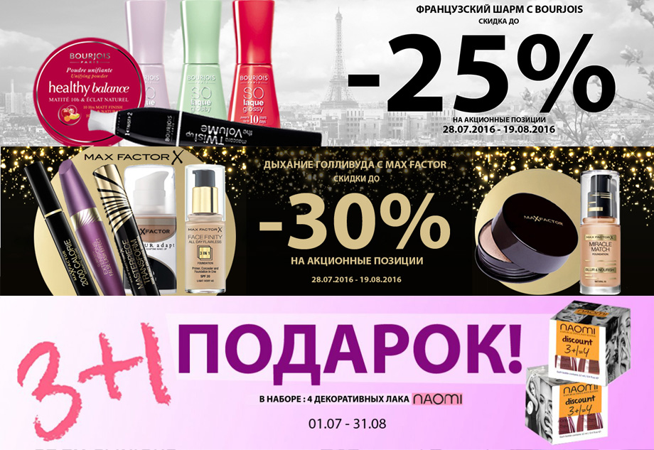 В онлайн-магазине действуют скидки: 25% – на Caudalie, Borjois, 30% – на Max Factor. Все покупатели Naomi и G La Color получат гарантированные подарки. До конца недели действуют скидки на нишевую парфюмерию. До конца месяца в магазине действует скидка 60% на лаки для ногтей. Sisters.com.ua