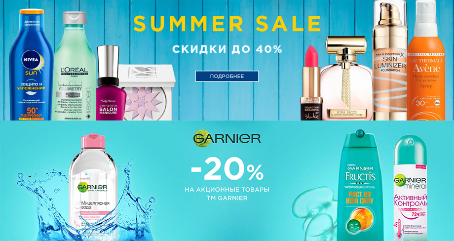 В магазине действует Summer Sale – скидка 15% на определенные товары. Действуют скидки 20% на продукцию Garnier и 30% – на Ninelle. Всех покупателей продукции L’Oreal Professionel, AHAVA, QIRINESS, Patrice Beaute, Avene, Revlon, Hempz, Declare, Estel, Glossip, Sholl ждут гарантированные подарки. Подробности о каждой акции, список марок и стоимость продуктов уточняйте на сайте. Makeup.com.ua