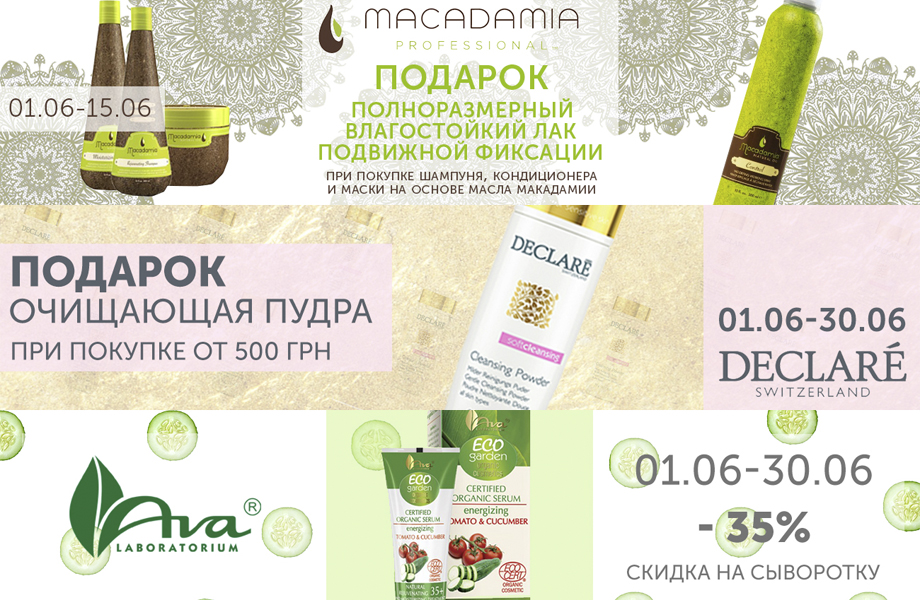 До 15 июня при покупке шампуня, маски и кондиционера Macadamia Professional в подарок вы получаете лак влагостойкий подвижной фиксации Macadamia Professional Oil Control Fast-Drying Working Spray. До конца месяца при покупке акционных позиций Hempz от 700 грн – в Подарок защитный бальзам для губ с SPF 15. При покупке акционных позиций Jean d’Arcel от 900 грн – в подарок набор из 3 ампул: концентрат для лица Jean dArcel Cure douceur для куперозной кожи с HypoCalm3, интенсивно увлажняющий концентрат Jean dArcel Hydratante Cure hydro delice, нормализующий концентрат антисептик Jean dArcel Cour Normalisa. Очищающая пудра Declaré в подарок при покупке акционных позиций от 500 грн. До конца месяца действует скидка 35% на омолаживающую сыворотку AVA Laboratorium Eco Garden Certified. До 30 июля действует скидка 25% на двухфазные спреи Estel Professional Curex. Sisters.com.ua