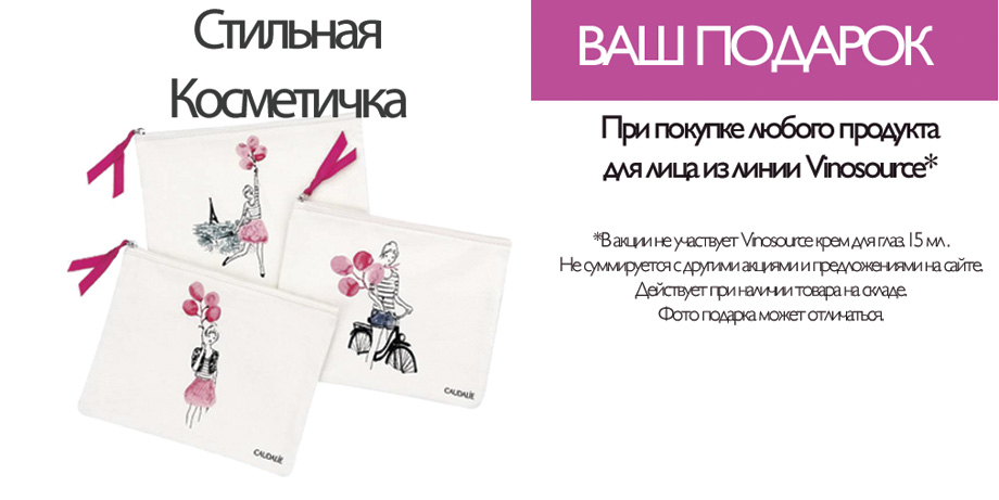 До окончания подарочного фонда в магазине действуют такие акции: при покупке продукта из программы Vinosource ваш подарок — стильная косметичка. Учтите: акция не распространяется на продукт по уходу за кожей вокруг глаз Vinosource. При покупке двух средств из линии «Очищение» в подарок получите очищающий крем-скраб или крем-эксфолиант. Миниатюры не участвуют в акции. На один чек – один подарок. Акция не суммируется с другими акциями.