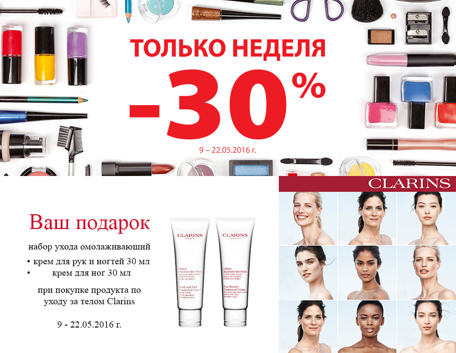 До 22 мая действует скидка 30% на косметику и парфюмерию CALVIN KLEIN, Davidoff, Pola, Orlane, Collistar, Ferre, Armand Basi, Lacoste, Angel Schlesser,Blumarine, DSQUARED2, Make up Factory, James Bond, Misslyn, ANNY, Ayres, Loewe, La Prairie, V&R, Giorgio Armani, YSL, Euphytos, Phytomer, Deborah, Transvital, Adidas. Скидка по дисконтной карте не суммируется. До 22 мая при покупке продукта по уходу за телом Clarins в подарок – набор по уходу «Омолаживающий» (кремы для рук и для ног). Также до 20 июня на туши Clarins действует специальная цена. Покупатели продукции Annayake, Caudalie, Ayres и Skincode получат гарантированные подарки. Подробности – на Letu.ua.