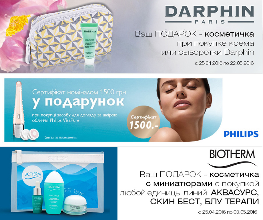 При покупке средств Biotherm, Lancome, IsaDora и Darphin до 22 мая вы гарантированно получаете подарок: косметичку с наполнением. Только сегодня при покупке мужского аромата Givenchy Gentlemen Only casual Classic в подарок – гель для душа. Покупая гаджет по уходу за кожей Philips VisaPure, в подарок получите сертификат номиналом 1500 грн. Bomond.com.ua