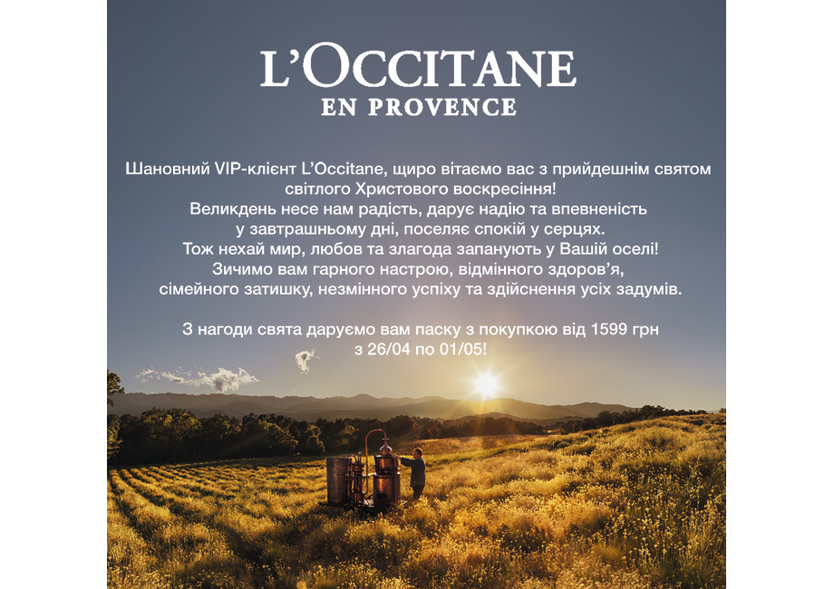 В честь наступающего праздника в магазинах бренда каждый покупатель, совершивший покупку на сумму от 1599 грн, получит в подарок праздничную пасху. До 15 мая при осуществлении покупки от 799 грн покупатели получат мини-набор «Миндальный уход» в подарок (косметичка, 2 крема для рук по 10мл и пилочка). Также действует скидка 25% на наборы линии «Миндаль». Ua.loccitane.com.