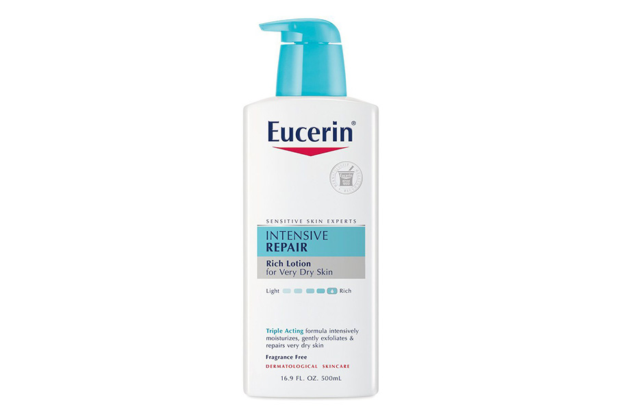 Затем, после душа, Хадид увлажняет тело и лицо питательным лосьоном Eucerin Intensive Repair Very Dry Skin Lotion: