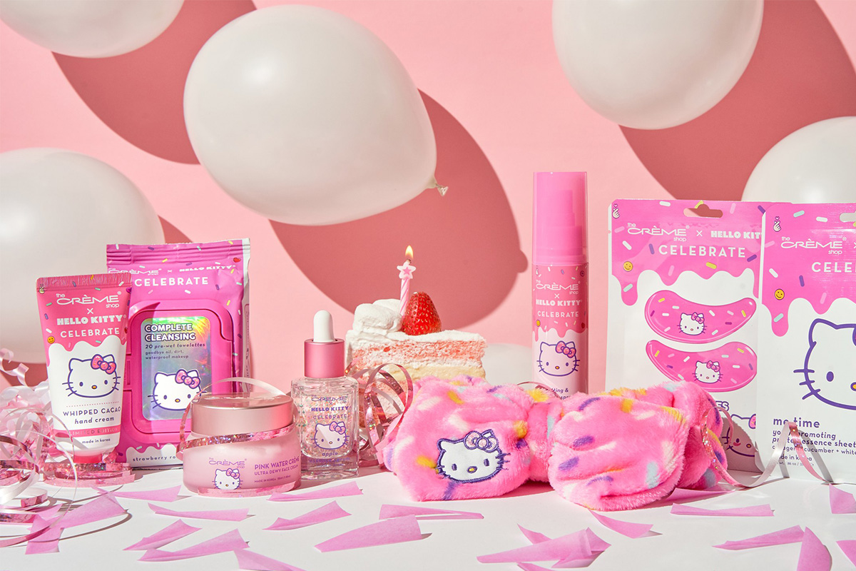 Юбилейная коллекция косметики The Crème Shop x Hello Kitty включает в себя восемь бьюти-средств: увлажняющий крем для лица, осветляющую сыворотку, гидрогелевые патчи под глаза, тканевую маску для лица, мист-спрей для лица, очищающие влажные салфетки-демакияж, крем для рук и плюшевую повязку-бант на голову. Праздничная линейка Celebrate нацелена на увлажнение и разглаживание мимических морщин, а главными компонентами бьюти-средств стали гиалуроновая кислота, коллаген, экстракт огурца и белого чая, а также витамин Е.