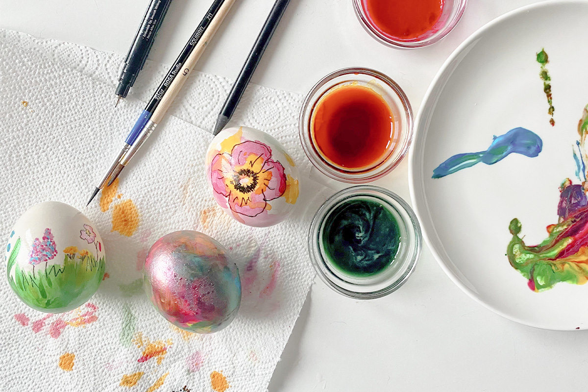 Так как пищевые красители для пасхальных яиц очень похожи на акварельные и акриловые краски, мы подумали, что ими можно попробовать поработать точно так же, как и этими художественными материалами.
