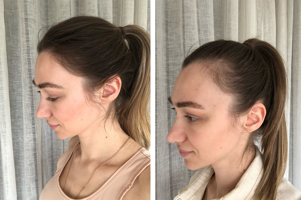 – Нет, не длину — сейчас я себя абсолютно комфортно чувствую. Но густота… И это без преувеличений. Я на самом деле стала замечать, что во время расчёсывания на гребешке остаётся больше волос, чем раньше. В норме у человека в день выпадает 100-150 волосин. Считать, конечно, не считала, но визуального замечаю. Особенно проблему видно в височной части. То ли из-за пробора, то ли из-за частого гофрирования у корней, то ли из-за того, что постоянно провожу там рукой. Не знаю, но завязать высокий хвост я уже не могла. Поэтому срочно и занялась решением этой проблемы.