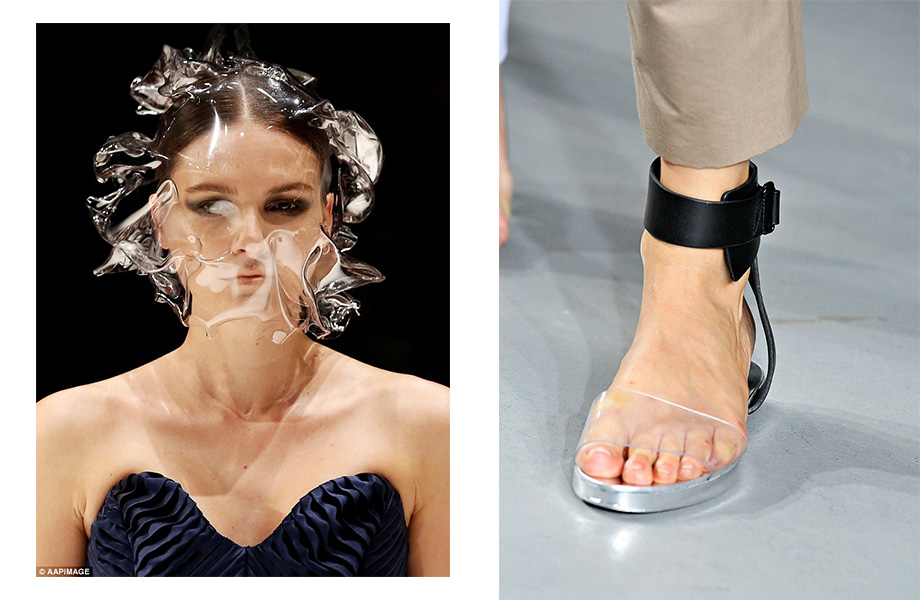Удивительным и в то же время практичным продолжением темы о том, что в новом сезоне все скрытое становится явным, по праву стали одежда, обувь и сумки из пластика в духе актуального футуризма. Здесь дизайнерам на руку сыграла уже небезызвестная нам проблема экологии. Впрочем, если облачаться в столь привлекающую взгляд фактуру с ног до головы кажется вам too much, то всегда можно ограничиться обувью с прозрачными вставками или предложить свою наглядную версию на популярный запрос what’s in my bag ? (что в моей сумке – в переводе с англ.).