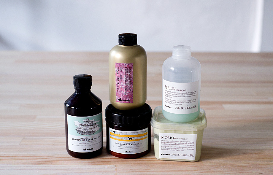 Слева направо: шампунь-скраб, выводящий токсины, Natural Tech, Davines, сыворотка для вьющихся волос This Is Curl, Davines, питательная маска для волос Natural Tech, Davines, шампунь Melu, Davines, кондиционер Momo, Davines