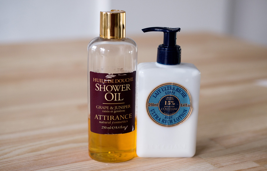 Слева направо: масло для душа «Можжевельник и виноград», Attirance, питательный лосьон для тела «Карите», L’Occitane