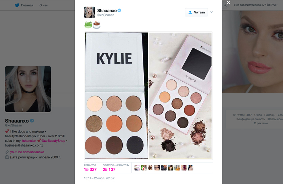 В июле прошлого года новозеландская бьюти-влогер Шеннон Харрис выложила в соцсетях фото палетки теней от Кайли и собственной линии косметики. Продукты мало чем отличались друг от друга: и упаковка, и оттенки уж больно были похожи. Разница только в том, что цена на Kyshadow была в четыре раза выше. После потока гневных комментариев от фанатов Кайли Шеннон Харрис решила отступить (кто она такая, чтобы тягаться с самой Дженнер), публично признав, что палетка от ее конкурентки намного круче. Интересно, что сама Кайли Дженнер вообще никак не прокомментировала инцидент: то ли была уверена в себе, то ли не нашлась что ответить.