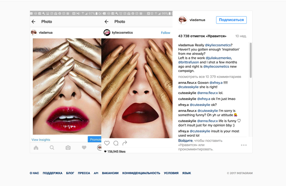 С одной стороны, так случается, когда успешные бренды разрабатывают свои продукты на основе анализа рынка – тогда они точно знают, что тени должны быть зелеными, а помада – с глиттером. С другой стороны, невольно повторить (иногда с точностью до мельчайших деталей) чужой продукт могут блогеры и знаменитости, которые выпускают «авторские» коллекции макияжа. За неимением опыта эти девушки вдохновляются работами знаменитых визажистов и косметических марок. Так произошло и с Кайли Дженнер. 19-летней наследнице клана Кардашьян удалось построить собственную многомиллионную бьюти-империю, но при этом оказаться в центре двух громких скандалов, связанных с плагиатом.