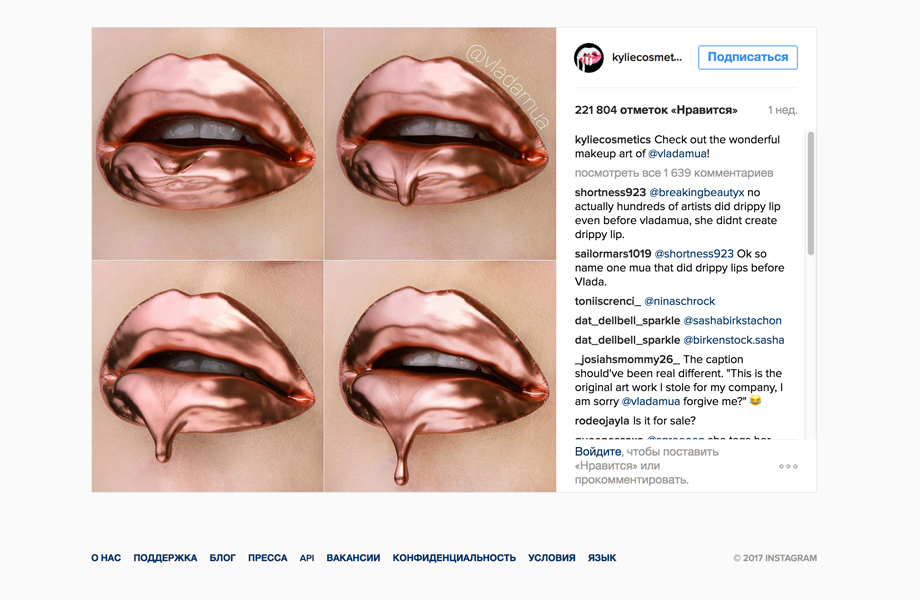 У Кайли ушло два месяца на то, чтобы признать свою вину. На днях она выложила в своем аккаунте изображение губ, на которых тает помада, – именно оно сейчас ассоциируется с ее брендом, но было придумано Владой Хаггерти и ее коллегами. Под фотографией Дженнер написала: «Это на самом деле все. Не забудьте насладиться великолепными работами @vladamua».
