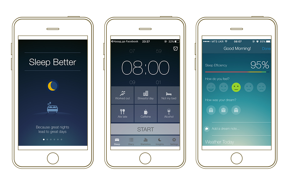Почему раньше было так сложно просыпаться по утрам, понимаешь, как только в смартфоне появляется специальное приложение Sleep Better. Оно высчитывает фазы сна, в которых находишься во время ночного отдыха, анализирует состояние сна, бессонницы. Определяет, как влияют дневная активность и пищевые привычки на это все, а также то, при каких обстоятельствах засыпать и просыпаться легче. Для анализа нужно на ночь оставить смартфон возле подушки.