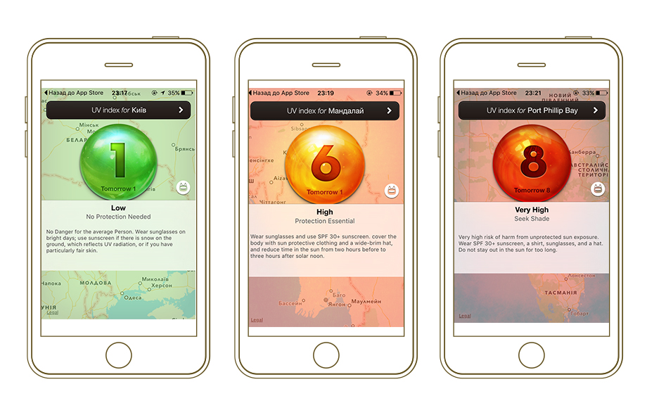 Если ты еще не уехала в отпуск, но собираешься, загляни в приложение и узнай, как обстоят дела с интенсивностью солнечного излучения в выбранной стране. Приложение хоть и на английском, но активность ультрафиолета показывает понятно – с помощью цвета. Зеленый – все отлично, желтый – нужна защита, и далее по нарастающей. Интерфейс простой и понятный, чтобы узнать необходимую информацию, достаточно навести прицел на карте.