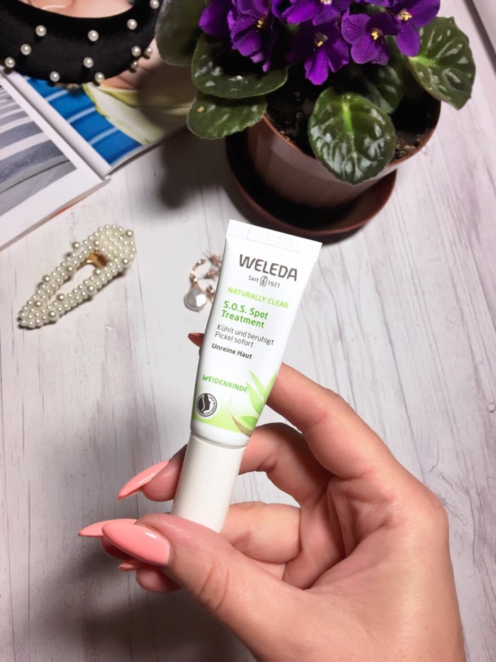 Есть еще одно средство, о котором я хочу рассказать, пользуюсь я им не часто. Только по необходимости, когда у меня появляются высыпания на лице или выскакивает в самый неподходящий момент прыщик, который сложно убрать! Еще один любимый мой бренд — Weleda. У него в арсенале средств есть Sos Spot Treatment – это средство для прыщей быстрого действия. Уменьшает видимые появления воспалений за пару дней. Коктейль из ценных растительных экстрактов коры ивы, корня солодки и гамамелиса обладает успокаивающим, охлаждающим и антибактериальным эффектом. Аромат у продукта натуральный-натуральный и средство очень эффективное – пару дней и все воспаления как рукой сняло. Это теперь моя новая любовь по борьбе с нежелательными высыпаниями. А они, к моему сожалению, часто у меня появляются!
