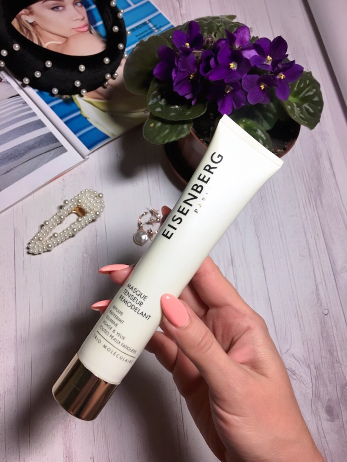 После пилинга я часто наношу маски для лица, так как маска естественно будет хорошо проникать в кожу и эффективнее работать после глубокого очищения. Есть у меня одна маска, которая всегда приводит кожу в порядок, особенно когда мне срочно нужно бежать на мероприятие. И это проверенная мной моя любимица от французского бренда Eisenberg. Маска моделирует и снимает усталость всего лишь за 15 минут, ее можно наносить даже на кожу вокруг глаз. После применения кожа становится светлее и придает здоровый блеск, а еще борется со старением!