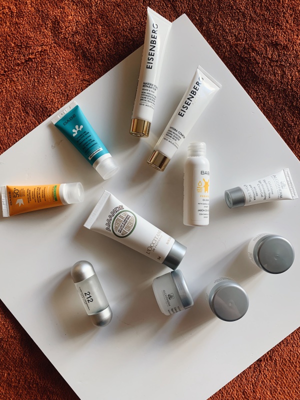 Часто путешествую, поэтому дома много миниатюр. Для меня это удобней, чем переливать средства в отдельные контейнеры. Также в поездки обязательно беру пару тканевых масок. Зимой привезла корейских из поездки в Китай.