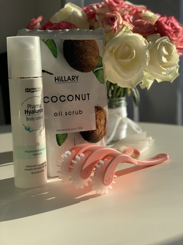 Для усиления микроциркуляции и гладкой кожи я использую скраб для тела и массажёр от AVQ store. Затем наношу лосьон для тела от Pharma Hyaluron.
