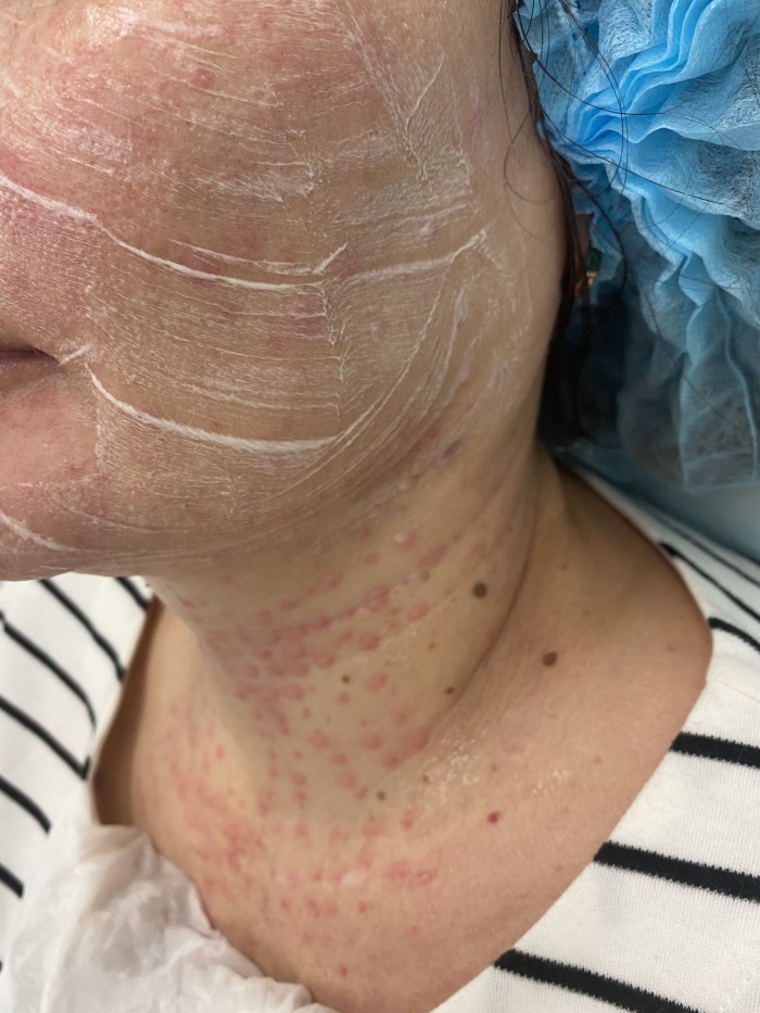 Сразу хочу отметить, что эффективность финальной процедуры мы сможем оценить в течение месяца (исходя из жизненного цикла фибробласта, отвечающего за выработку коллагена и эластина), а не сразу после исчезновения папул, как хотят все пациенты. После чего результат от пройденного курса редермализации пациент будет наблюдать от 6 до 9 месяцев.