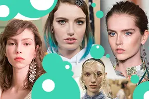 Один из самых ярких бьюти-образов поразил своей раскованностью и смелостью. Зацелованные губы – красная помада заметно вышла за контур. Ресницы прокрашены желтой тушью. Завершен образ оригинальными прическами: у некоторых моделей это были тугие хвосты с собранными в забавные круглые пучки волосами, а для некоторых – это косички с золотыми булавками в них.