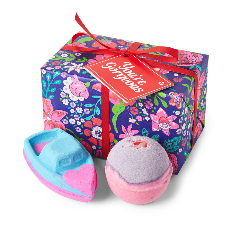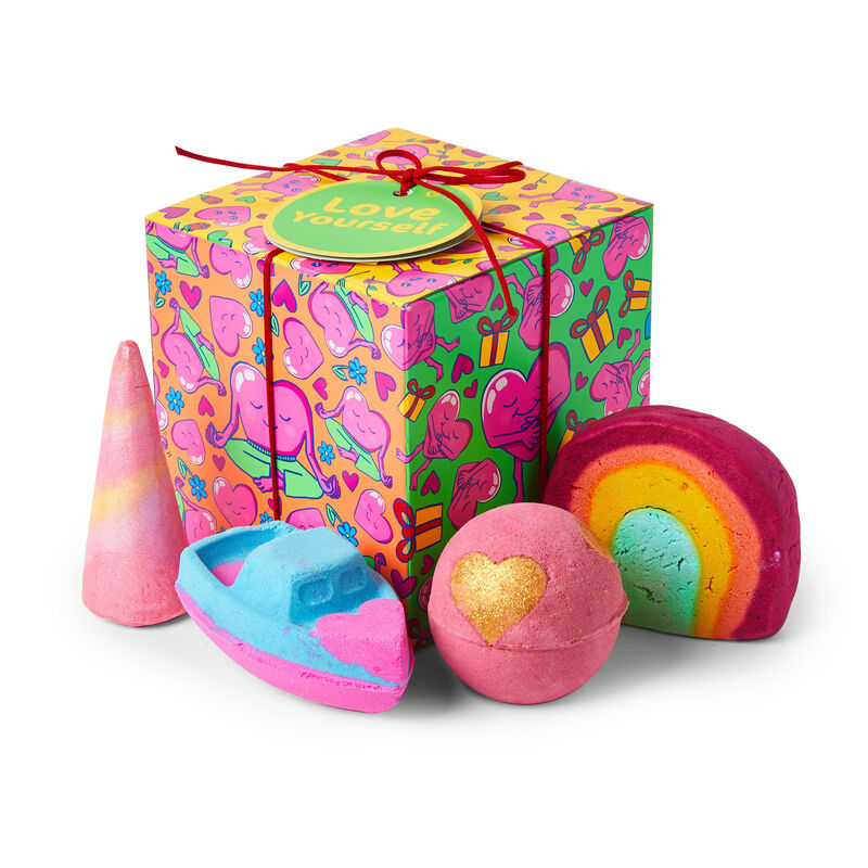 Тематическая линейка включает 4 подарочные коробки с милыми названиями Big Hugs, Lots of Love, Love Yourself и You’re Gorgeus. Содержание боксов соответствующее: интересные цветные пены и бомбы для ванн оригинальных форм, парфюмированные гели для душа, натуральные лосьоны для тела, а также лимитированные массажные масла. Три бомбы для ванны, которые собственно и являются фирменными продуктами бренда Lush, можно приобрести отдельно. «Ключ к наслаждению» приблизит домашний прием ванны до салонной SPA-процедуры благодаря уходовым компонентам в составе, а бомбы «Люби меня» и «Семь роз» создадут романтическую атмосферу. В коллекцию также входит пена для ванны в виде красных губ, которая поможет покрыть воду облаком из нежно-красных пузырьков.