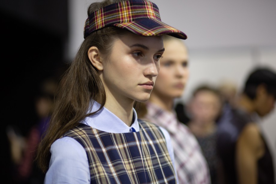 Несмотря на такой нейтральный осенний макияж, сама коллекция порадовала неожиданными сочетаниями цветов. Размытая клетка в принтах, очень интенсивный яркий розовый, темный коричневый, горчичный и типичный тартан, интеллигентная сине-бежевая клетка органично сочетались с мужской голубой сорочечной полоской и нежными оттенками лилового и бледно-голубого.