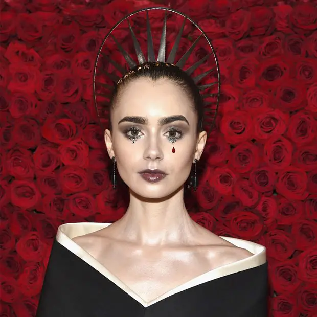 Лили Коллинз – лидирует в нашем рейтинге с макияжем глаз в коричнево-бордовой гамме, подчеркнутом глиттером и стразами. Он отлично гармонируют с бледным тоном кожи и полупрозрачной черничной помадой. Отдельно мы отметили великолепно оформленные брови.
