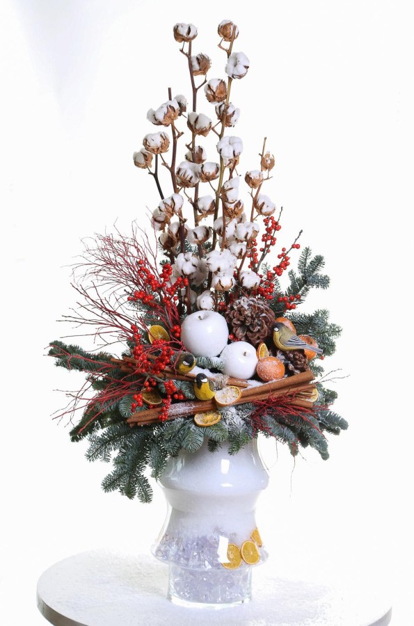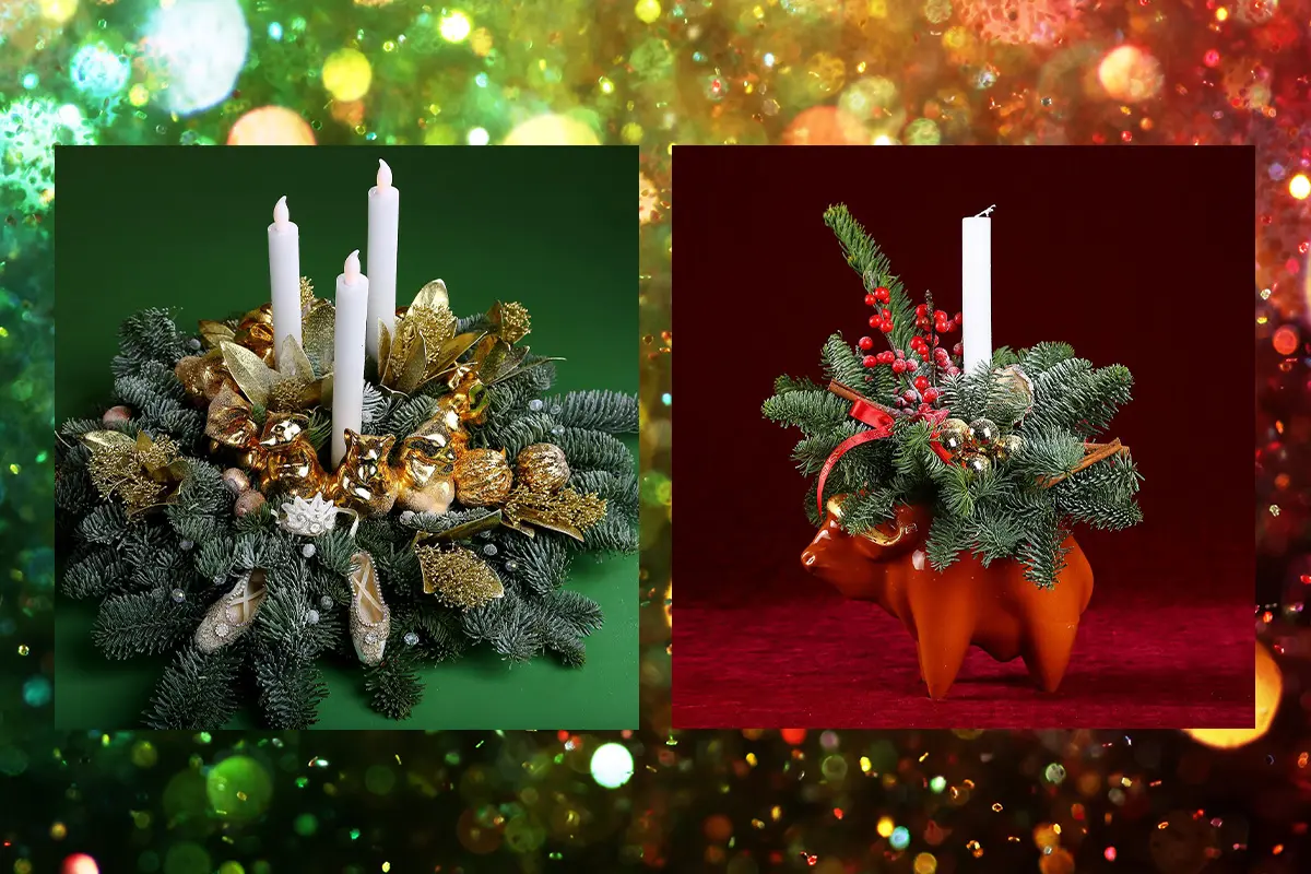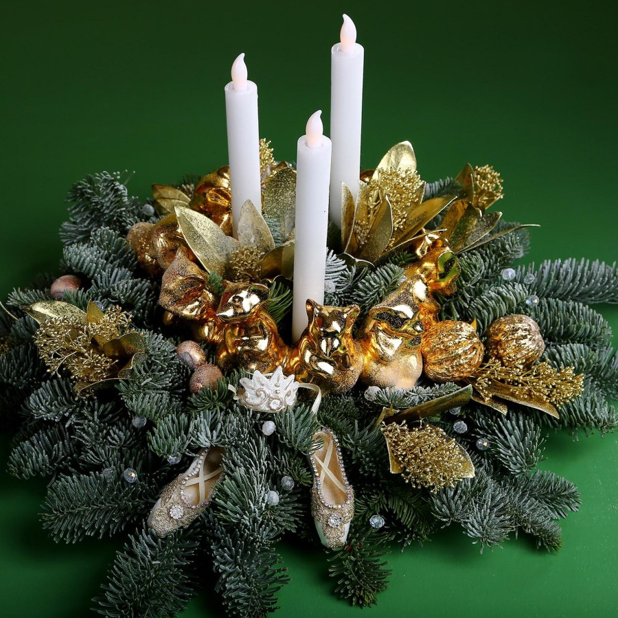 Настольный рождественский веночек со свечами – одна из разновидностей новогодних композиций. Но кроме него, него существует еще несметное количество вариантов. И к тому же зима – не повод расставаться с цветами! Пышная ароматная живая хвоя идеально сочетается с зимними амариллисами, белоснежным хлопком и елочными игрушками. В зависимости от идеи и вкусовых предпочтений, такими композициями можно рассказывать семейные истории или сказки детям.