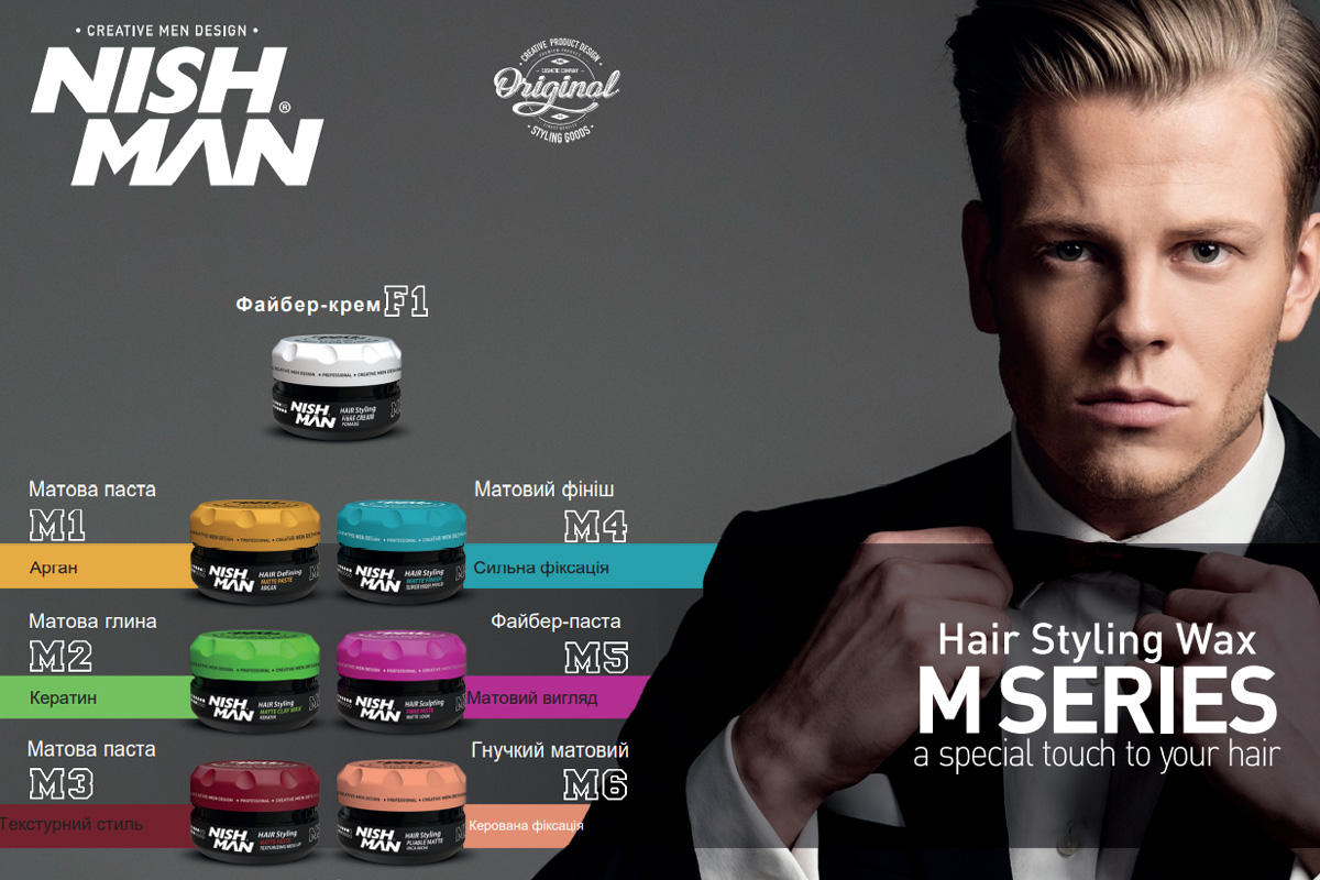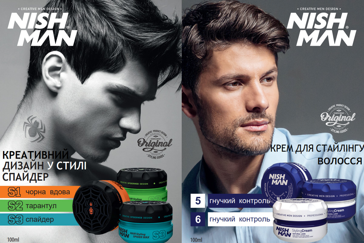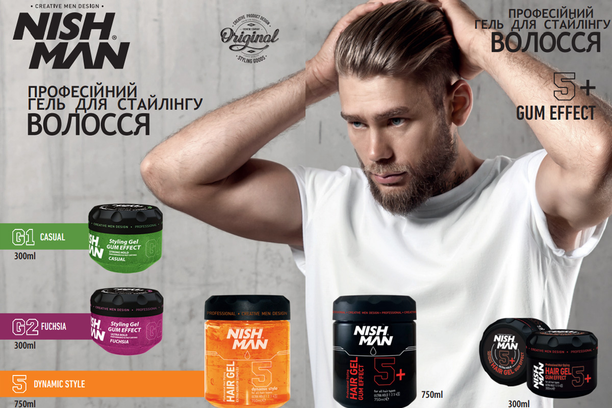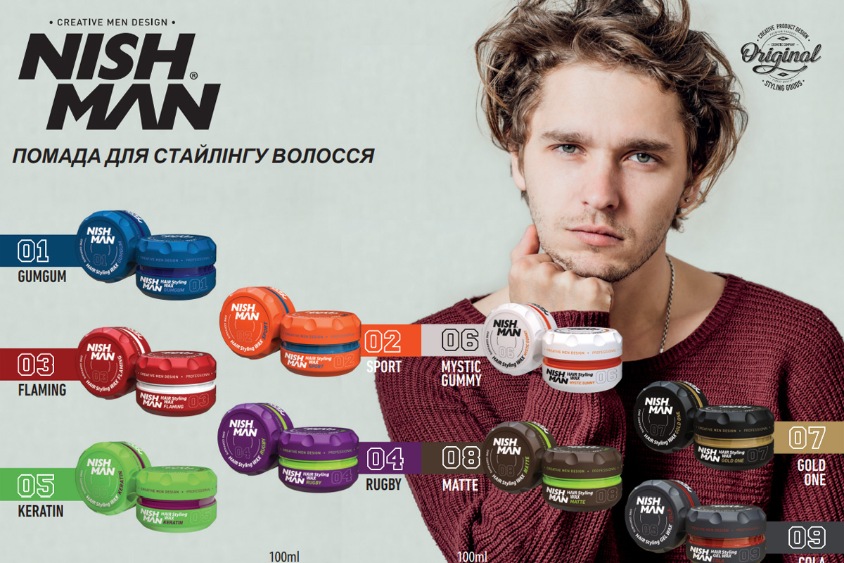 Средства для укладки. Придать образу презентабельного вида и привести в порядок непослушные волосы помогут специальные продукты для укладки. Дело в том, что гель поднимает волосы от кожи головы и фиксирует их в правильном месте, благодаря чему прическа становится более привлекательной, а сами волосы дольше остаются чище. Бренд Nishman предлагает несколько типов средств для стайлинга: помады, гели, спреи, пасты и глины. Такое разнообразие позволяет выбрать именно тот продукт, который подчеркнет ваш неповторимый имидж и максимально естественно приведет в порядок прическу.